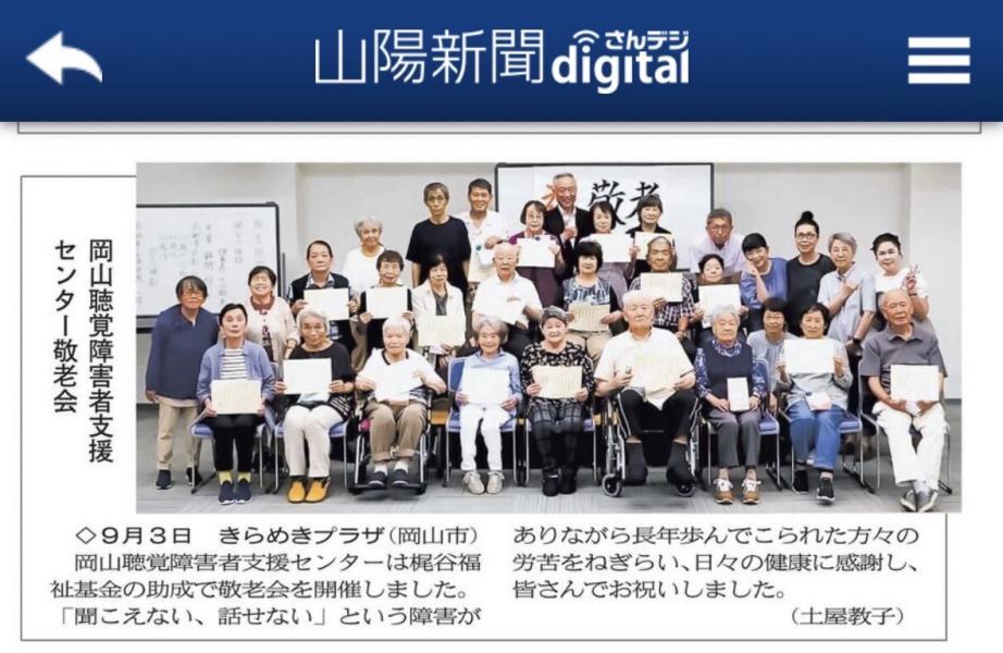 岡山聴覚障害者視線センターは「梶谷福祉基金」の助成を受けて敬老祝賀会を開催しました。「聞こえない」障がいがあり手話で話し、長年歩んでこられた方々の労苦をねぎらい、健康と長寿を皆さんで祈念しました。