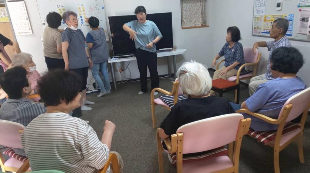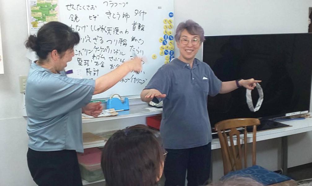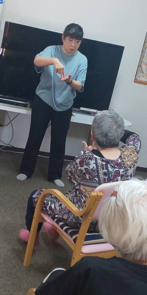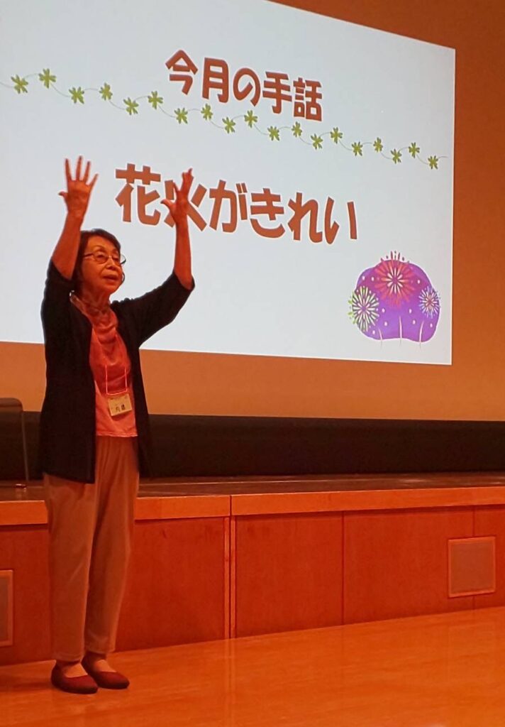 岡山南ふれあいセンター(南区福田)で、毎月第1金曜日に開催されている「介護予防教室」。毎回、前半が終わったところで、「今月の手話」をみなさんに紹介! 8月はNさんが手話で「花火がきれいです!」を紹介しました。
