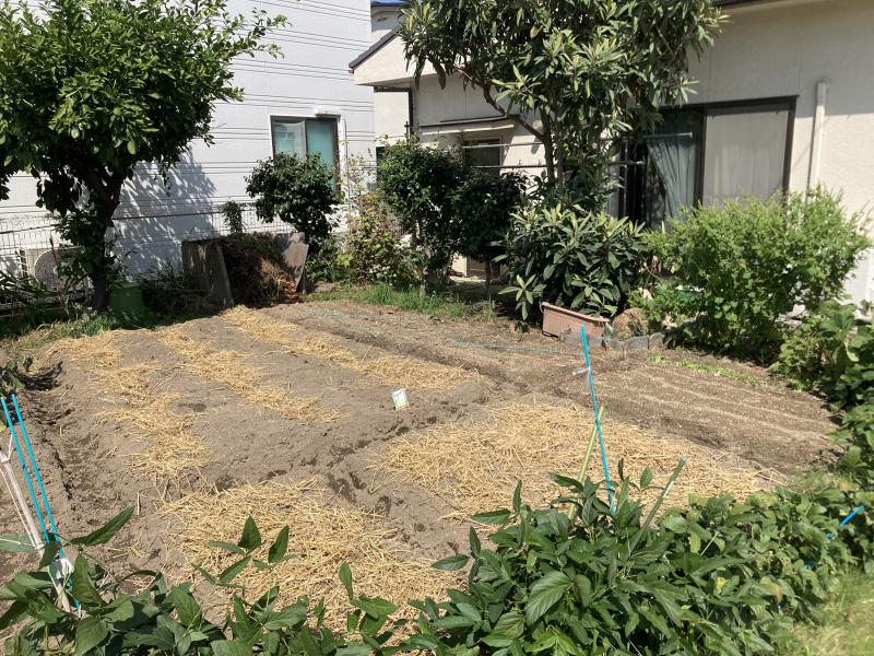 6/23、昨年より24日も早く梅雨が明けました。日中は暑いため、太陽が沈んでから日除けのシートを2枚取りつけました。