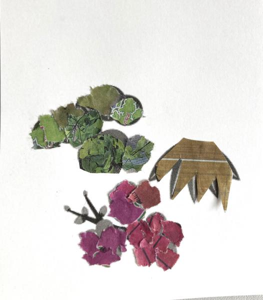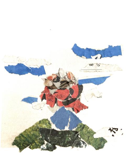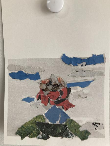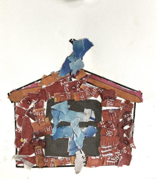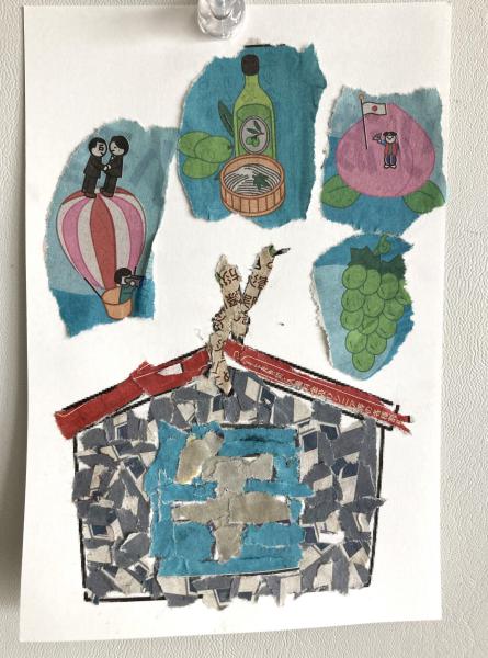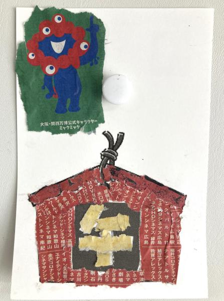 新聞紙のカラー広告を年賀状づくりのために、たくさん取っておきました。来年の干支(えと)は「午」(うま)。色紙を細かくちぎり、はがきに貼って作りました。干支(えと)の馬、絵馬、富士山と日の出など。