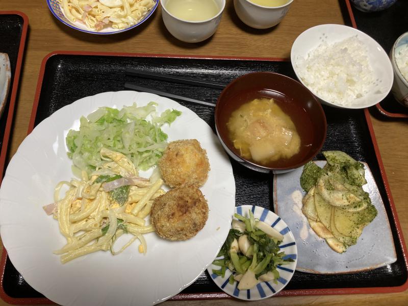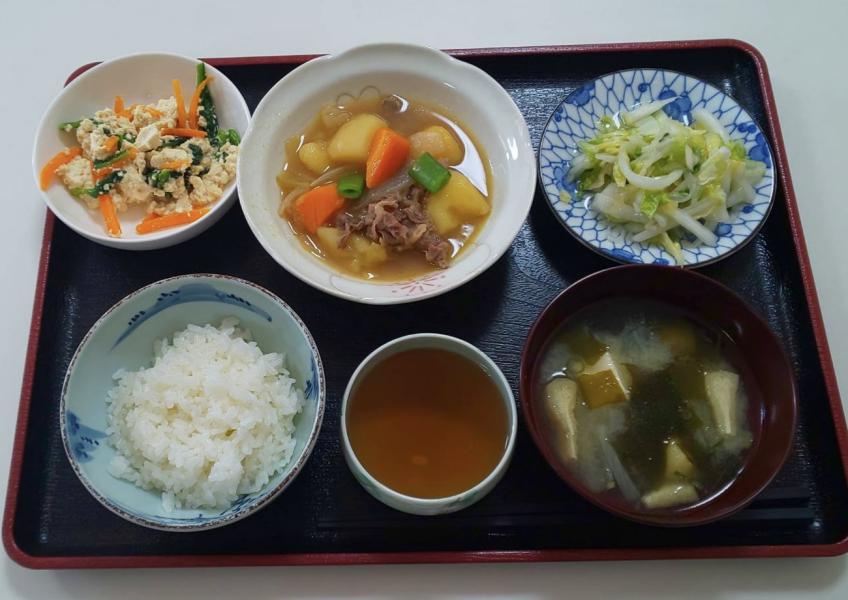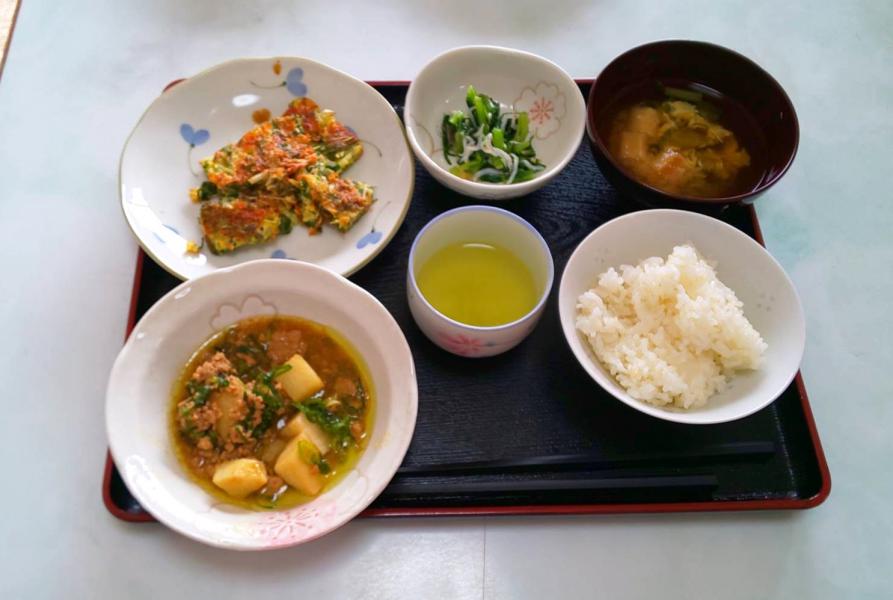 この日のお昼は、豚しゃぶ、カボチャの煮つけ、ほうれん草のごまあえ、ピーマンと昆布のあえものなど。デザートはピオーネで、美味しく頂きました!