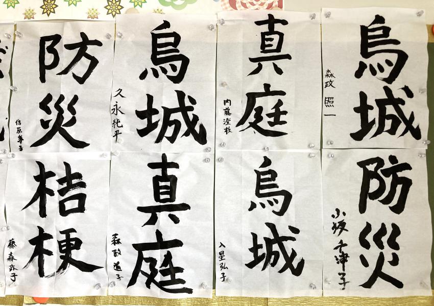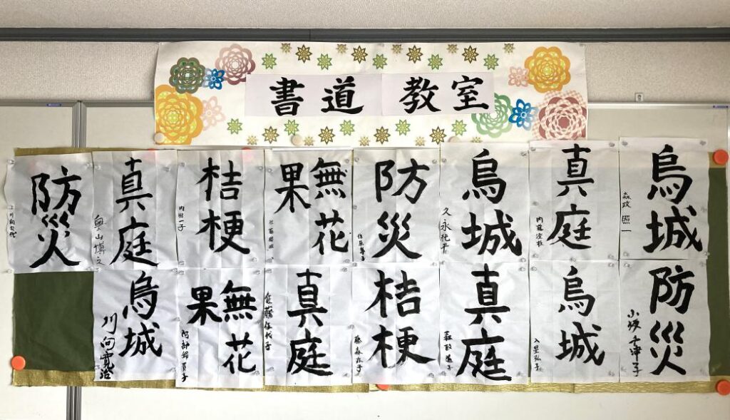 書道教室はとても人気です。新しい参加者が2名増えました。7月のお題は「左右」、「兜虫」、「かぶと虫」、「胡瓜」、「冷麺」、「蒜山」。