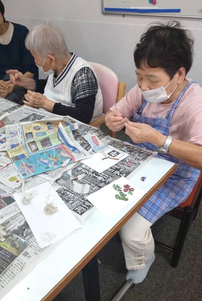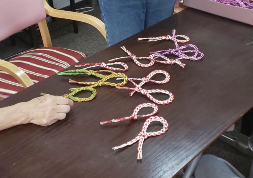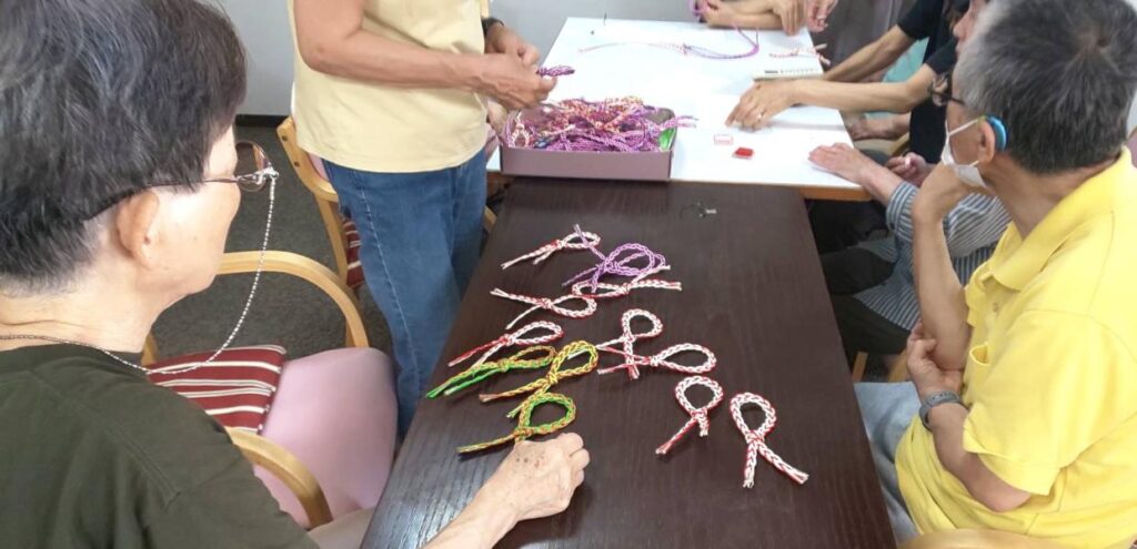 9月2日は「敬老祝賀会」。お弁当につけるお祝いの包装紙や水引きを作りました。(Q.水引きとは? ⇒ 贈答品の包み紙などに用いられる飾り紐(かざりひも)のこと。)