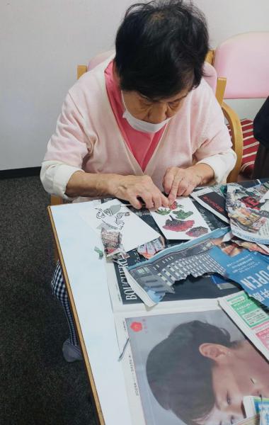 6/24。88歳のFさん。この日は昼食の一鉢を考えて「わかめときゅうりの酢の物」を作りました。普段は1人分しか作らないため、みなさんの料理を作ることはできないと思っていました。しかし、料理担当の方と一緒に16人分の一鉢を作ることができました。みなさんから「美味しかったよ!」と言われ、うれしそうに喜ばれていました。