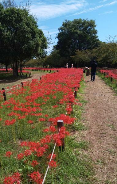 秋晴れの日、「ももハウス」から車で3分。児島湖花回廊(こじまこはなかいろう)へ彼岸花を見に行きました! 一面に赤いじゅうたんを敷き詰めたようで、とてもきれいでした!