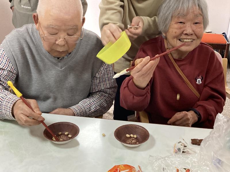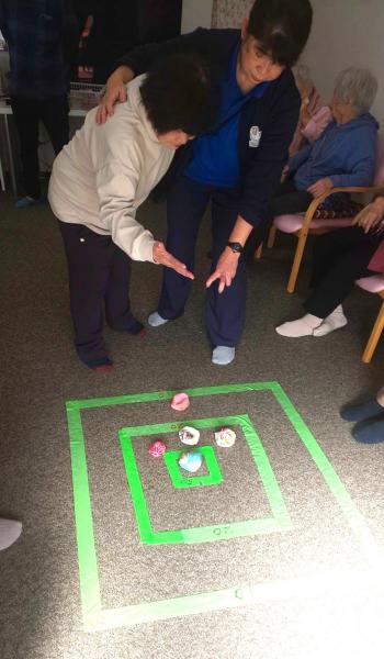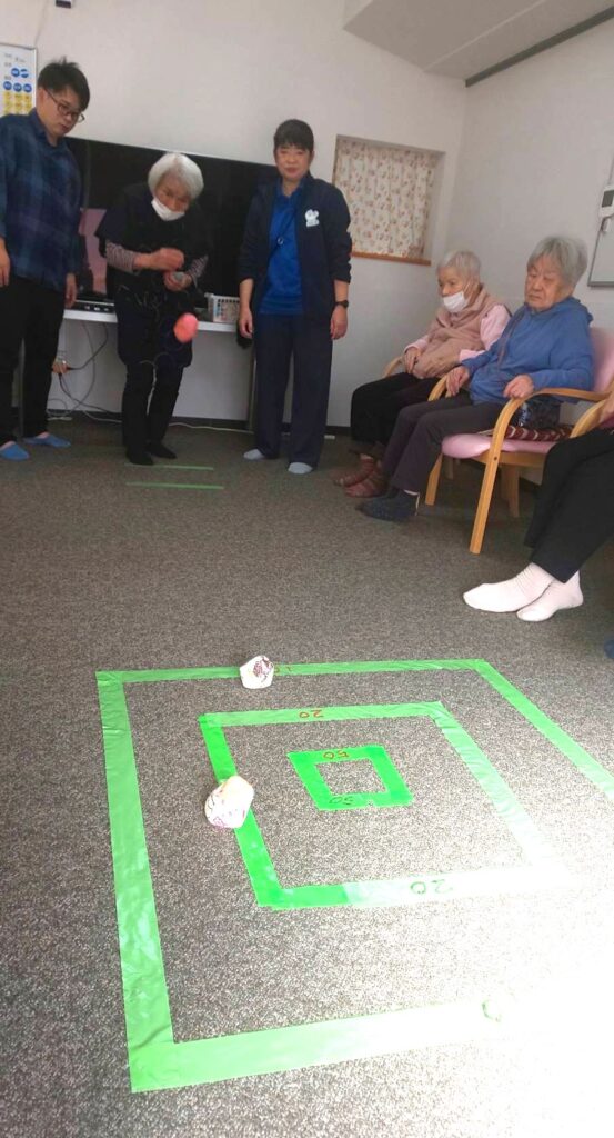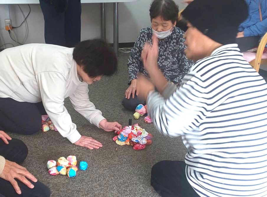 朝のあいさつが終わると、みなさん元気よく「あっぱれ桃太郎体操」をします。そのあと、午前の活動は昔なつかしの「お手玉」を使ったゲーム。床にテープで枠を作り、中心に入れると50点! 外に向けて20点、10点となる。投げるお手玉は1人5コ。投げた後は、頭の体操! 自分で得点を計算します。 誰が1番になったかな??
