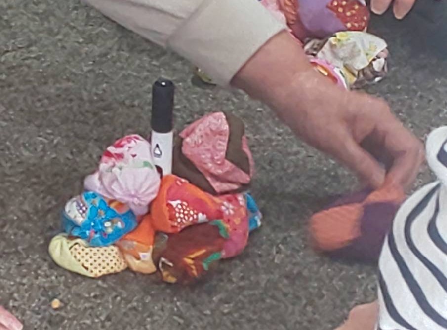 そこで、棒をホワイトボードの「ペン」に代えて、お手玉をつんだ中にペンを立てて、順番にお手玉をとっていく。ペンが倒れたら「アウト」! ハラハラドキドキしながら、お手玉を取りのぞきました。