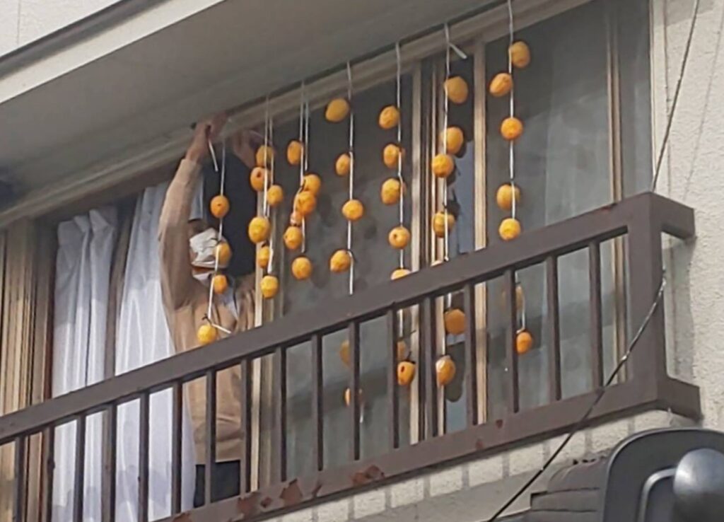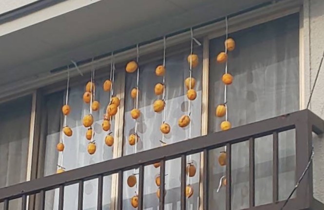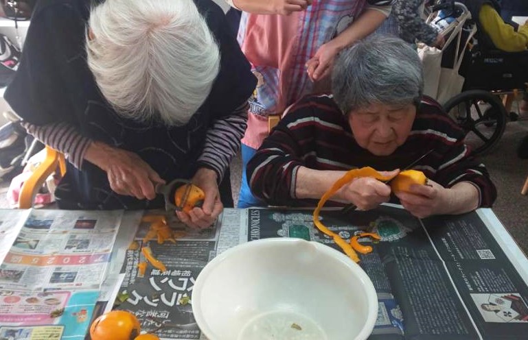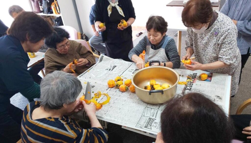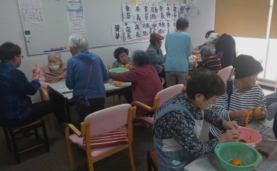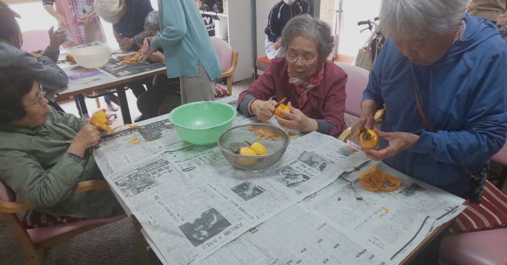 11月4日(火)午後。しぶ柿をたくさん頂きました。みなさんで柿の皮をきました。女性のみなさんは手慣れたものです。この日、最年長の92歳の女性は「田舎で育ち、子どもの頃から柿の皮むきをしていて得意なもの!」と言われ、上手にむいていました。2階の窓際に吊るした干し柿は、「ももハウス」の秋の風物詩となっています。