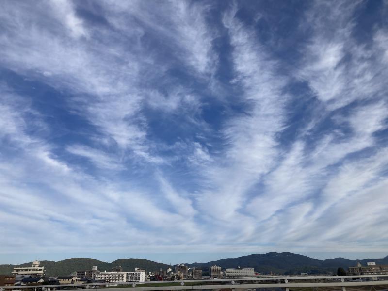 前日から天気予報では、全国的に放射冷却の影響で今朝は今季1番の冷え込みになると。岡山市では、朝6:30の気温が 5.6℃。平年差-3.5℃、前日差 -2.0℃と、11月下旬の気温だったそうです。 7:40に高齢者をお迎えに出た北の空には、通称:すじ雲。正式名は「巻雲」(けんうん)がきれいに出ていました。 これは上層雲の一つで、最も高いところに発生するそうです。温度が低く氷の粒でできているのが特徴で、ジェット気流が通り空気の流れが速くなる秋や春は、この「巻雲」が多く見られるそうです。