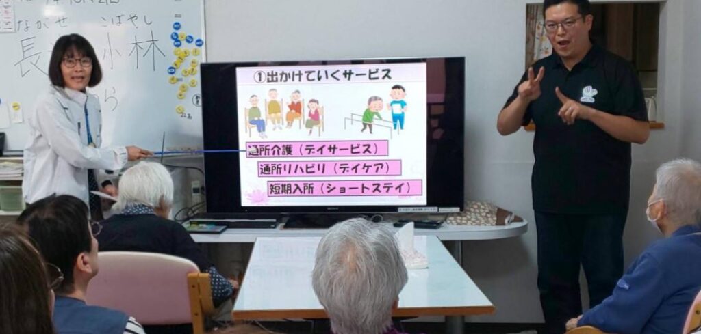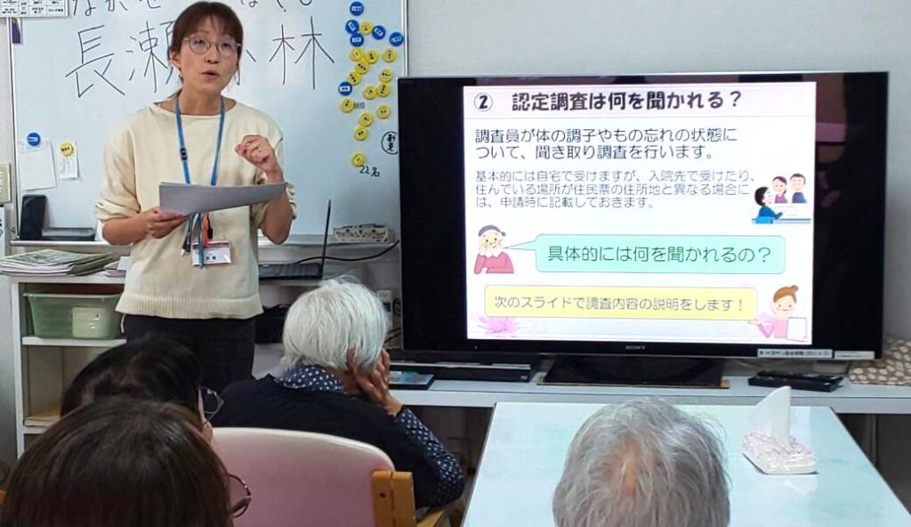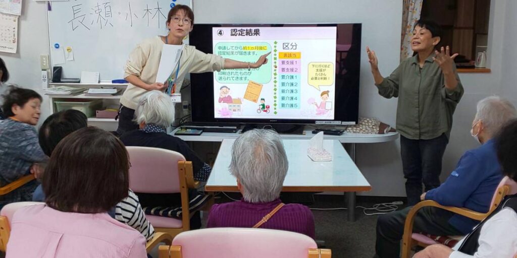 岡山市南区地域包括支援センター 市場分室(南区市場)より2名の方が来られて、「介護保険」のしくみや内容について学びました。