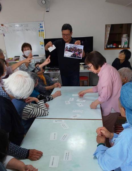 10月21日(火)午後。「作品展」に出す20枚近い写真。写真を見て、机上に並べたタイトルを(カルタ取りのようにして)探しだすゲームをしました。みなさん楽しんで、タイトル探しをしました。