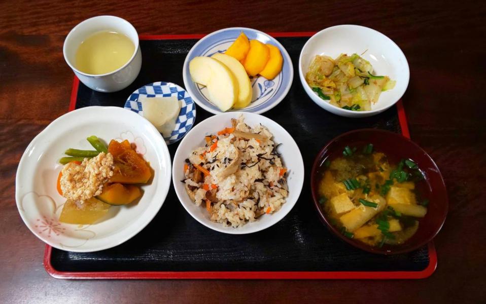 10月21日(火)お昼ご飯。 きのこの炊き込みご飯、冬瓜(とうがん)のそぼろあんかけ、白菜煮、豆腐の味噌汁、お漬物、りんご、柿