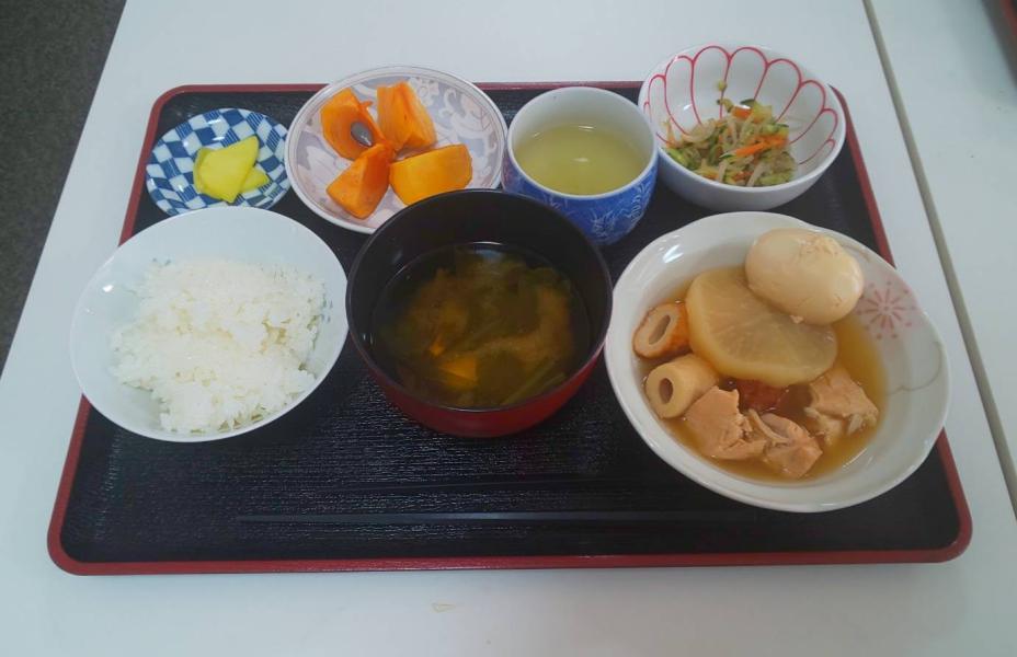 11月4日(火)のお昼ご飯。おでん、酢の物、みそ汁、漬物、柿 美味しく頂きました ^^) !~