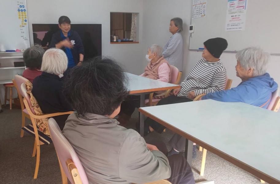 3月25日、岡山県介護福祉士会より加納忠紘さんを招いて「生活の中で「危ない!」をなくそう」について学びました。お家の中で転んだり椅子やベッドから落ちたり、食べ物をのどにつめないようにするためにはどうすればよいのか??椅子に座った状態で具体的に教えて頂きました。みなさん真剣に聴いていました。お家の中での事故を防ぐには、まずは自分達の身体の衰えや変化をよく知っておくことが重要であることを学びました。