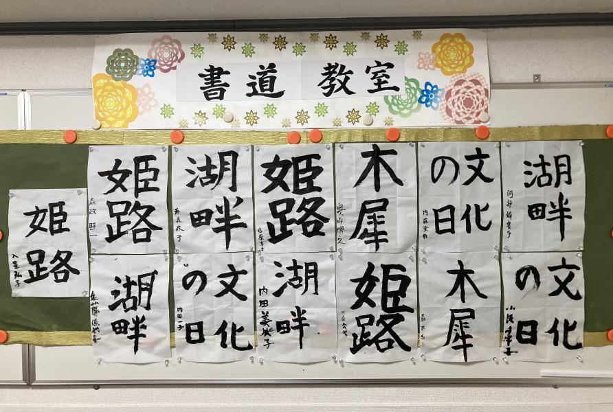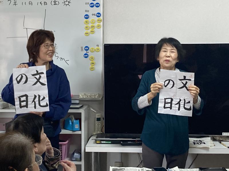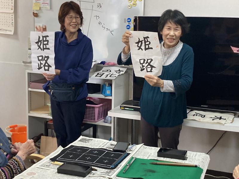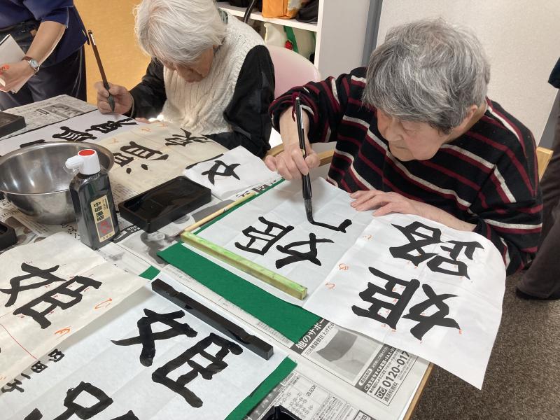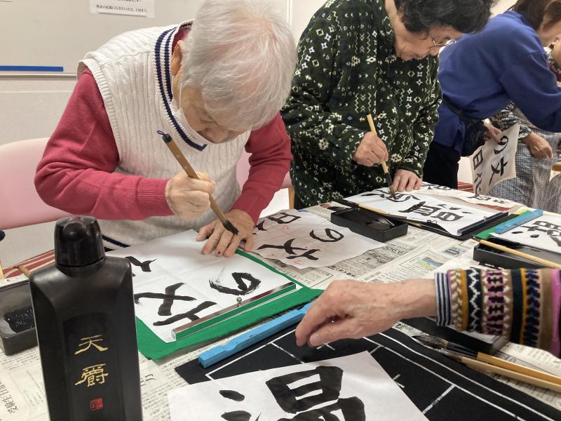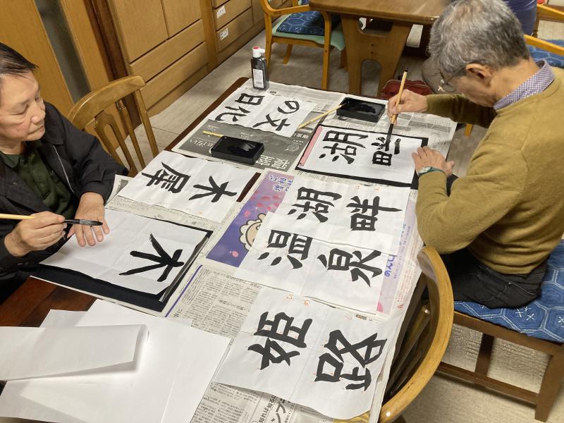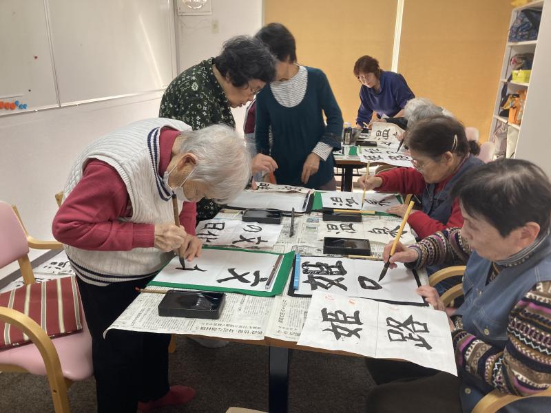 みなさんに人気の「書道教室」! この日より自分用の小筆を使ってお稽古。大筆はみなさん自分用で書く。みなさんの感想は「毎回、難しいけれどとっても楽しいです!」 「もっと上手に書きたい!」 「書道をしている時は無心になって集中するのていい!」「先生に書いた字をほめてもらえ、とてもうれしい!」など。来月の12月は長半紙に挑戦します!