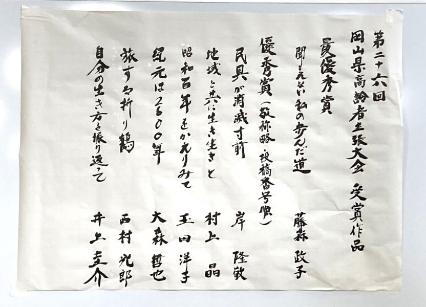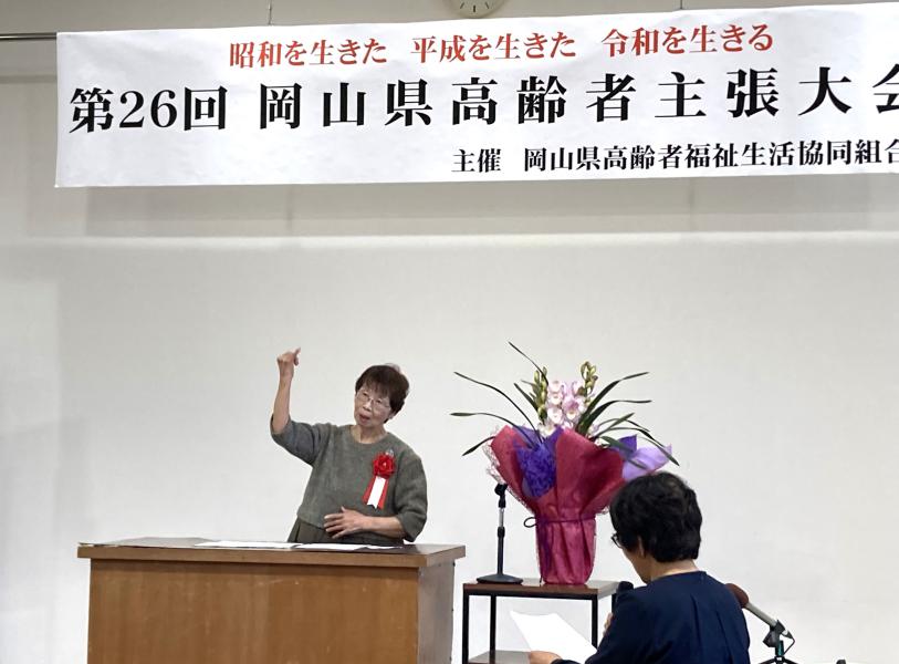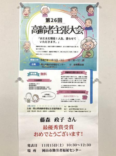 11月15日(土) 第26階高齢者主張大会が、岡山市勤労者福祉センターで開催されました。(主催:岡山県高齢者福祉生活協同組合)68名の応募者より、「ももハウス」の藤森政子さんが「最優秀賞」を受賞されました。おめでとうございます!