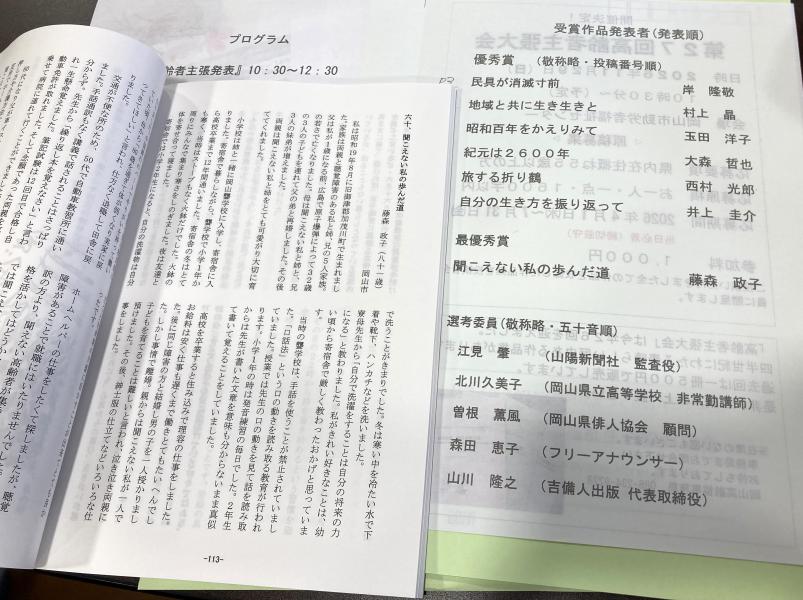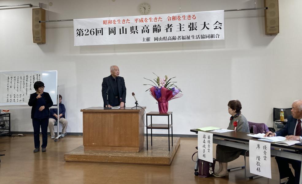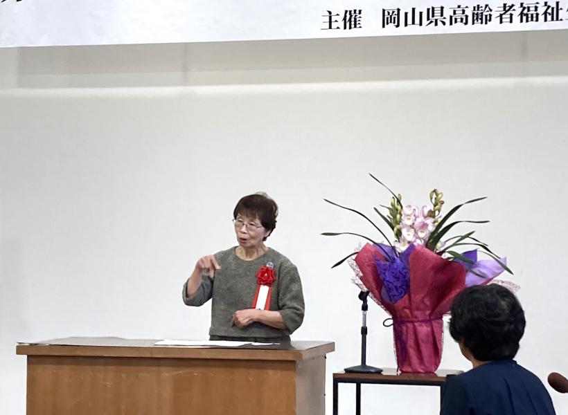 第26回高齢者主張大会の開会あいさつで、主催者の岡山県高齢者福祉生活協同組合の理事長 長崎 司 氏より「今日からデフリンピック東京大会が始まります。」 ・・「藤森政子さん、68作品のなかより最優秀賞に選ばれました。誠におめでとうございます!」とたたえられました。(写真はその場面です)