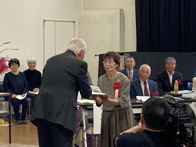 75歳以上の方々に大江理事長から表彰状と記念品を贈呈されました。「ももハウス」の最高齢は大正15年生まれの99歳の女性。会場での最高齢者は93歳のお方で、娘さんと一緒に表彰を受けました。