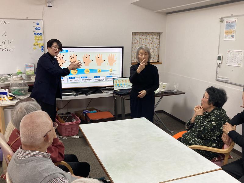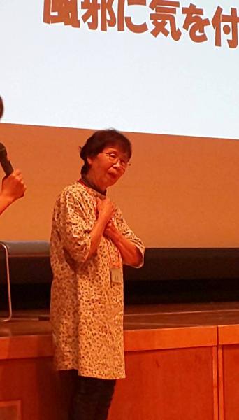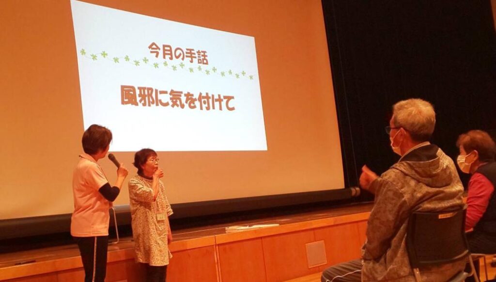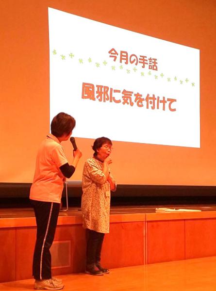 ワンポイント手話では「ももハウス」の方が前に出て手話を紹介。今回は「風邪に気を付けて」の手話を60名近い受講生のみなさんに教えました。