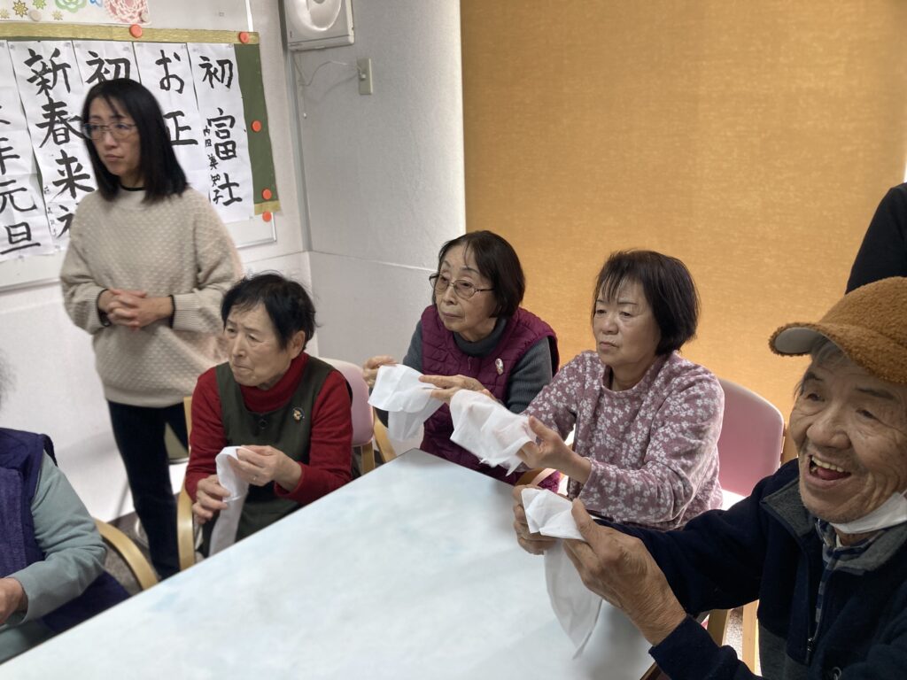 1月6日(火)「新年おたのしみ会」では、「戦国どじょうすくい中本さん」の安来節や傘回しに魅了されました。そのあと「福笑い」をしました。大江理事長さんや役員さんの顔を、みなさん上手に作られていました ^^) !~~ 「笑う門には福来る」(笑)