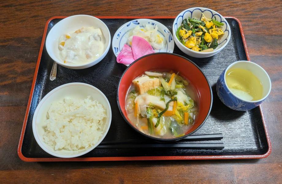 11月4日(火)お昼ご飯を紹介! おでん、酢の物。柿は農業デビューした坂口さんからたくさん頂きました ^^)!