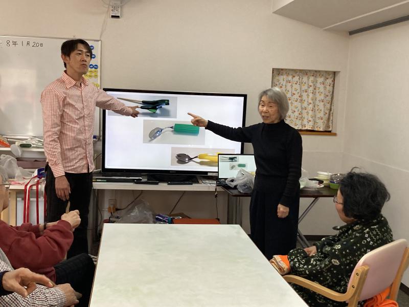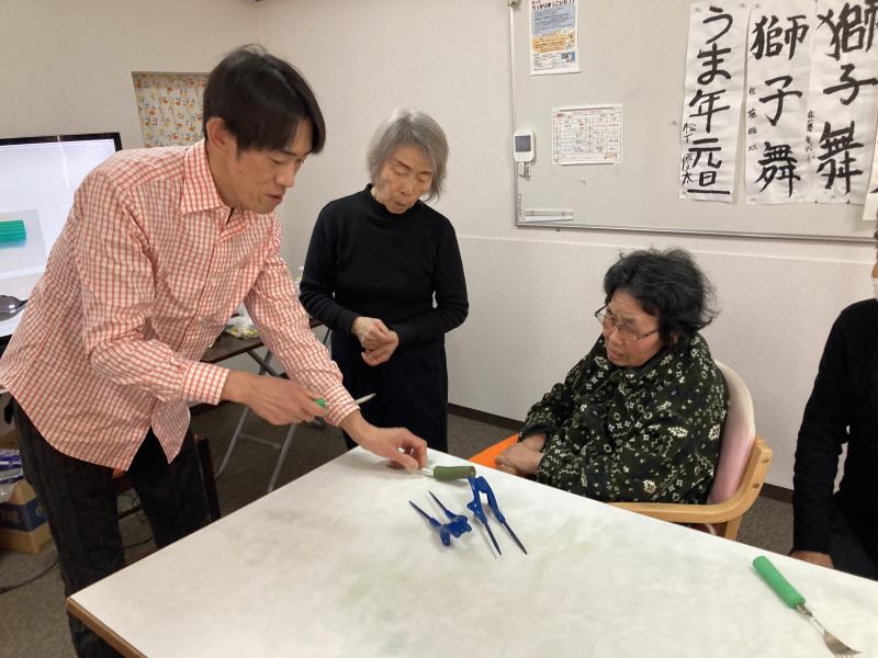1月20日(火)岡山県介護福祉士会より高齢者施設で働く介護福祉士さんと、介護福祉士を養成する専門学院の介護技術の先生が今年も講師にやってきました! 前半は「自助具ってなに?}をテーマに、特殊スプーンやお箸、片手1本で野菜が切れる特殊なまな板などを紹介。さらには、靴下をはくための自助具「ソックスエイド」を紹介。自分たちでも作れるよう設計図と材料を置いて行ってくれました!