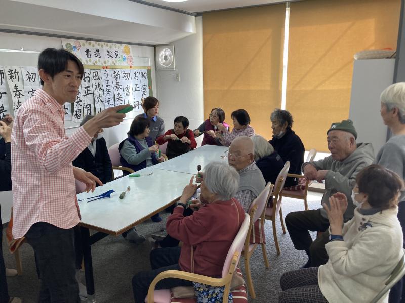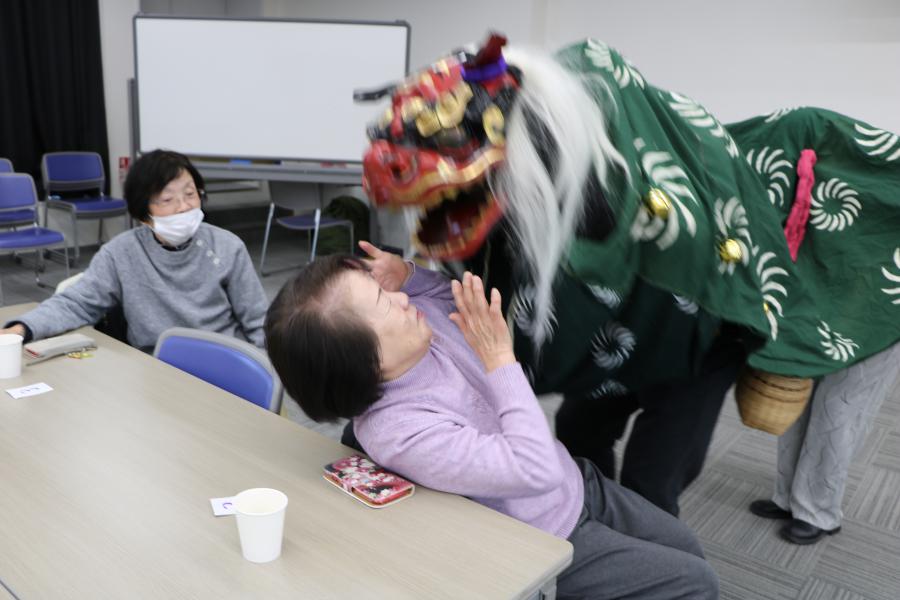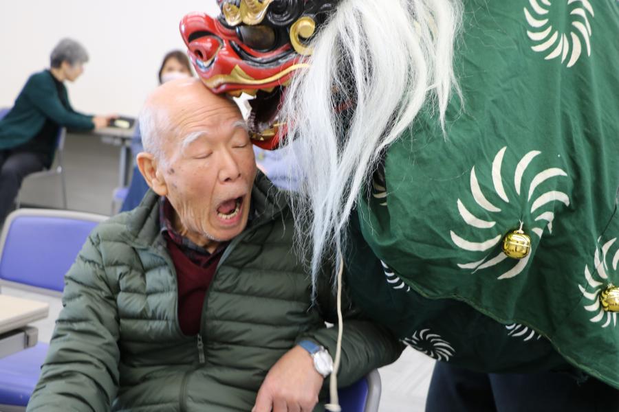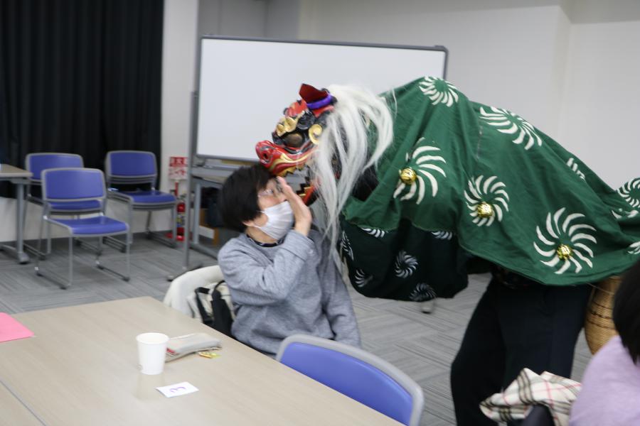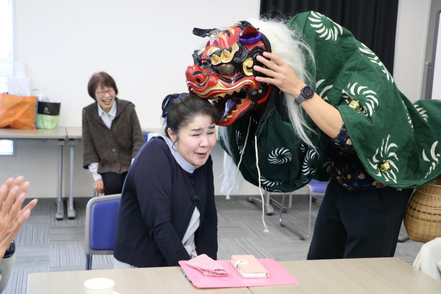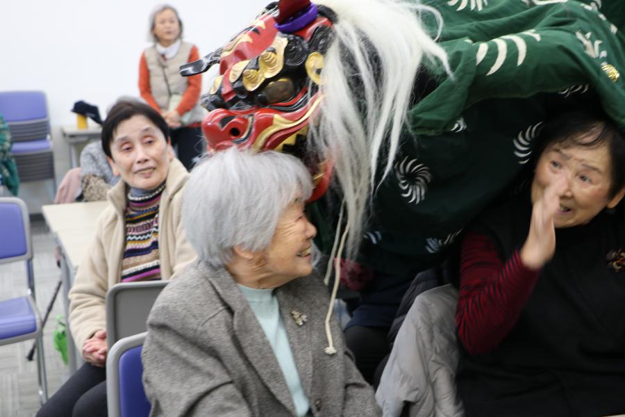獅子舞(ししまい)は7世紀に中国から伝わりました。獅子舞は「邪気(じゃき)払い」や「疫病退散」を行うお正月の縁起物(えんぎもの)です。参加したみなさんは、獅子に頭や肩などをかじられてびっくり驚いたり、また喜んだりしていました。※「邪気払い」とは? 病魔から霊力で払うこと。 ※「疫病退散」とは? 病気がなくなることを祈ること