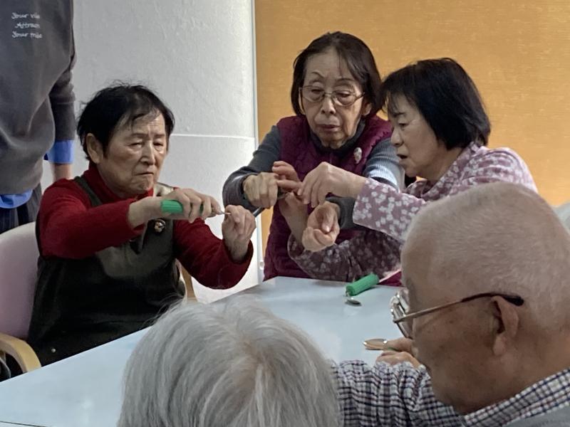 岡山県介護福祉士会より、高齢者施設に勤務する介護福祉士さんがこられて学習会をしました。「いつまでも元気に暮らすための体力づくり」ということで、スライドで学んだあと、足を使った「新聞まきゲーム」でチームに分かれて競争しました。いかに早く、長~い新聞を足で巻きとるか! みなさん一生けんめいになって楽しまれていました。