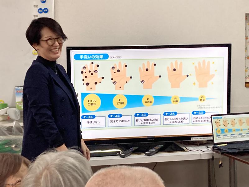 1月20日(火)、後半は「手洗いについて」。始めに「手洗いの効果」を学びました。【ケース①】手洗いなし⇒バイ菌 約100万個。【ケース②】流水で15秒⇒バイ菌 約1万個。【ケース③】 石けん30秒もみ洗い+流水15秒⇒ バイ菌 約100個。【ケース④】石けん60秒もみ洗い+流水15秒⇒バイ菌 約10個。【ケース⑤】石けん10秒もみ洗い+流水15秒×2回する⇒バイ菌 数個。